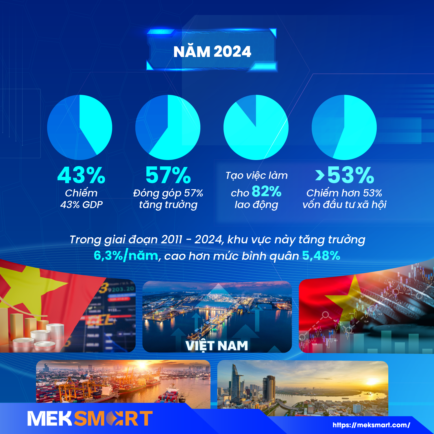 Kinh tế tư nhân Việt Nam ghi dấu ấn rõ nét qua những con số biết nói: năm 2024 chiếm 43% GDP, đóng góp 57% tăng trưởng, tạo việc làm cho 82% lao động và chiếm hơn 53% vốn đầu tư xã hội. Trong giai đoạn 2011 - 2024, khu vực này tăng trưởng 6,3%/năm, cao hơn mức bình quân 5,48%.